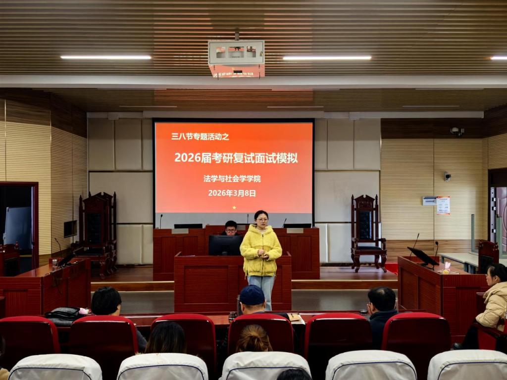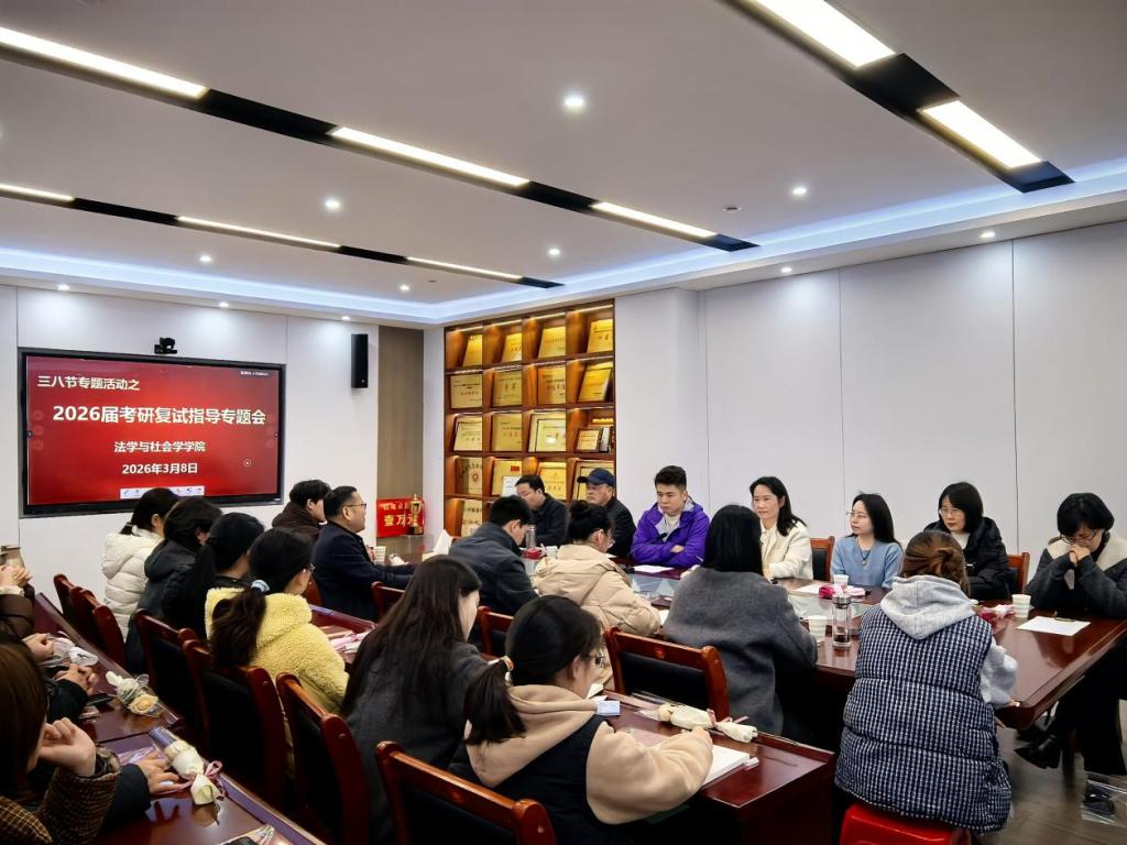 时间:2026-03-09 11:53 来源: 作者: 阅读: 次为助力2026届考研学子精准备战复试,全面提升应试综合素养,3月8日,信阳师范大学法学与社会学学院以“三八节”专题活动为载体,在社科楼412会议室举办2026届考研复试指导专题会。学院院长古瑞华、副院长张宇,部分专业骨干教师、毕业班辅导员及考研过国家线的同学参加会议,会议由张宇主持。